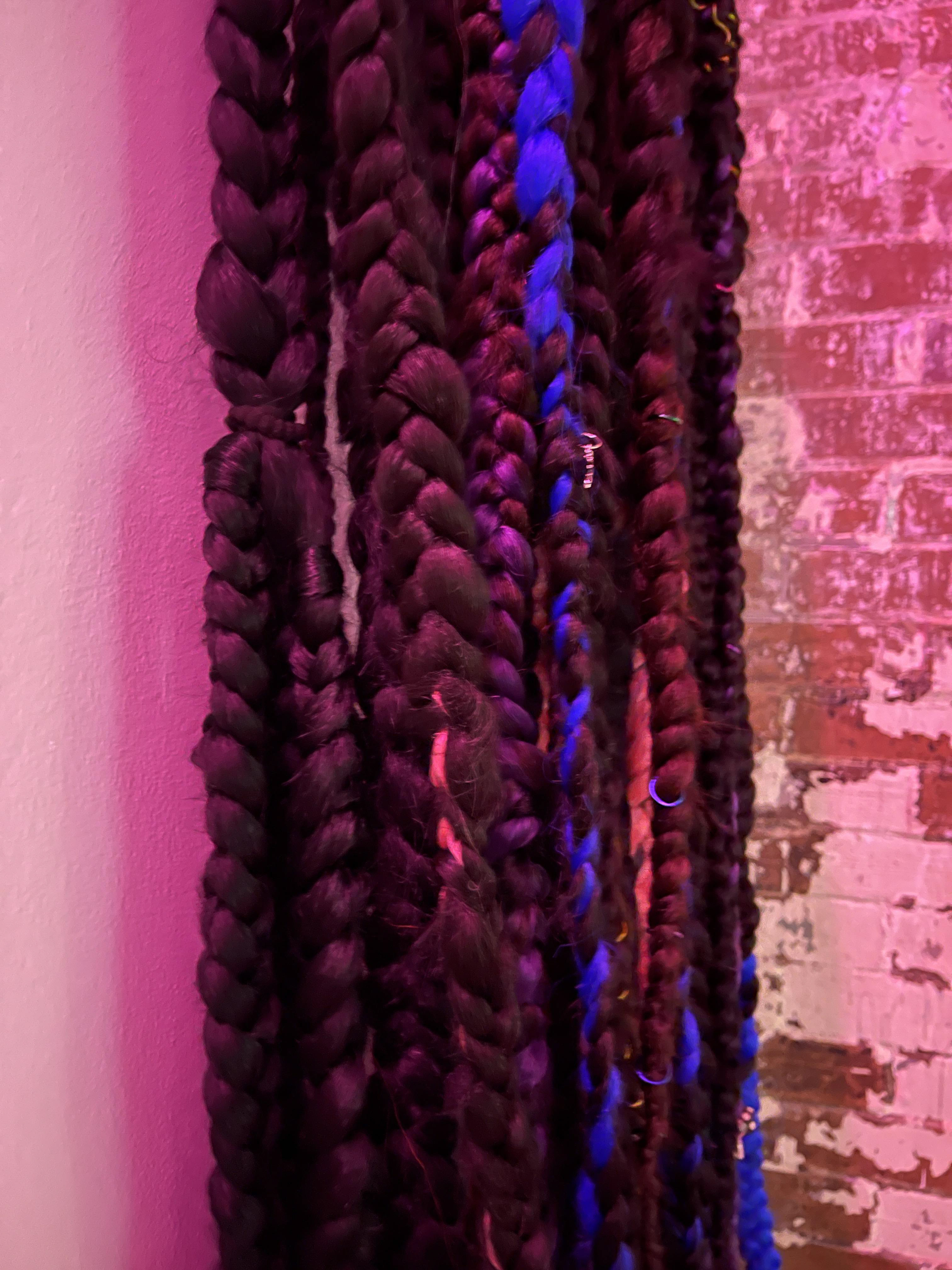 The one piece that was a bit more involved was the Hair installation. The goal was to hang the braided hair in a row, so when installed it looked as if the hair was growing out of the wall itself. To do this I designed a bracket for the hair to be connected to, then mounted directly to the drywall in the space. With some minor advisory from the Director of Exhibition, we were able to safely install the work that ended up weighing approximately 40lbs+