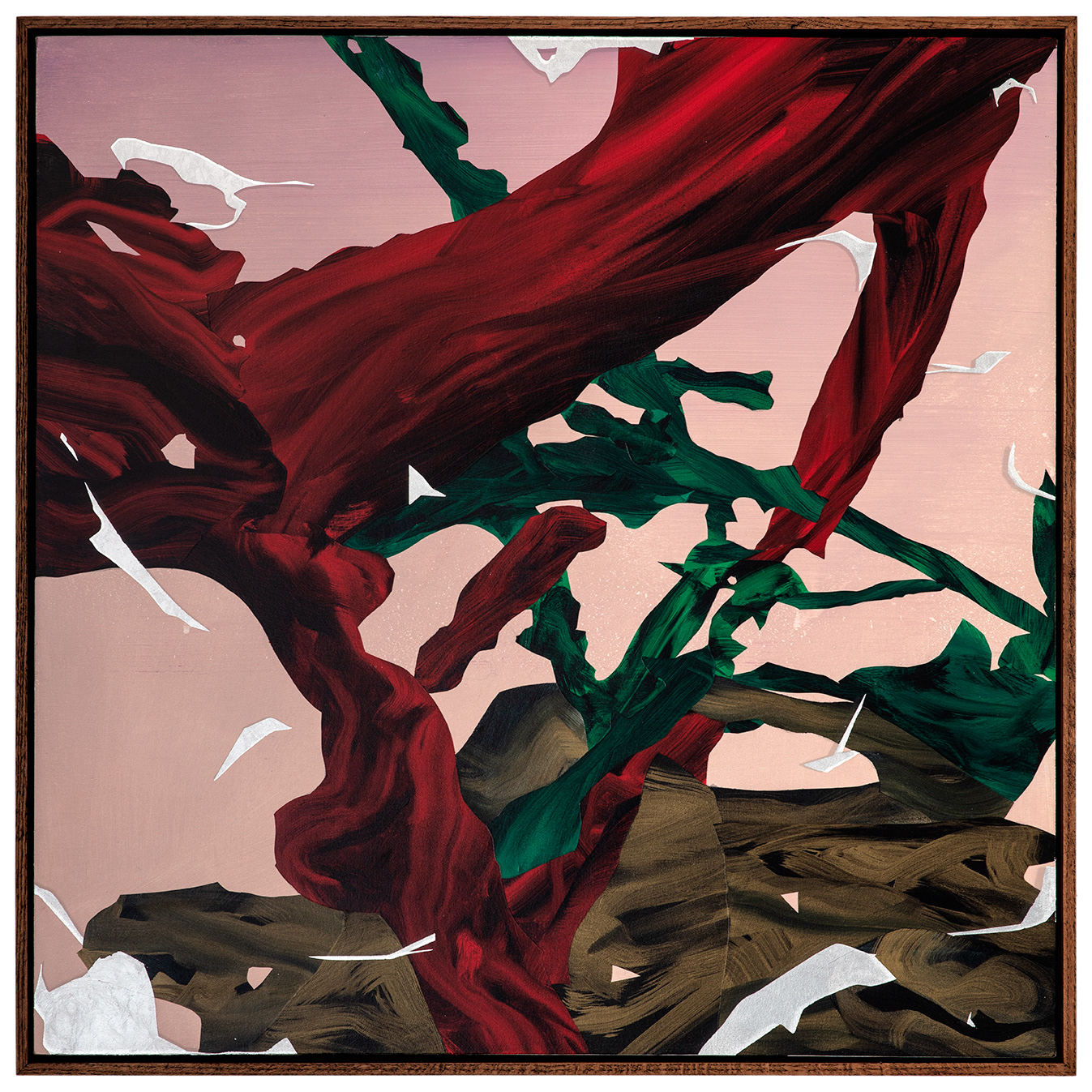 Acrylic, Spray Paint, and Silver Leaf on Canvas
